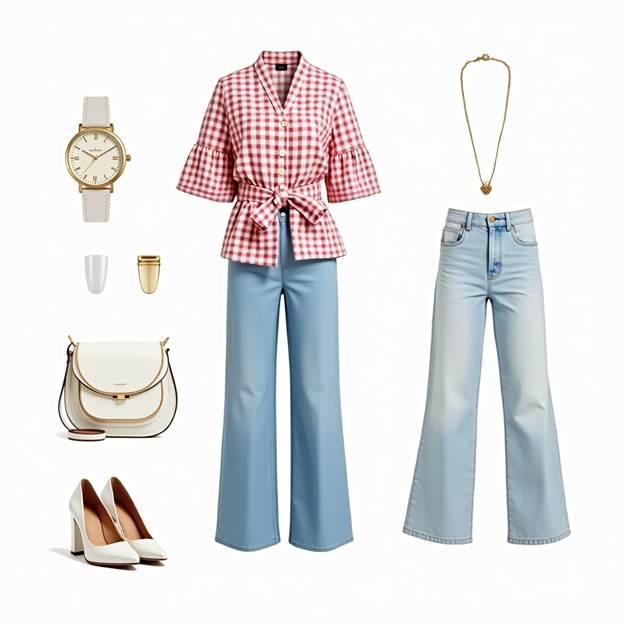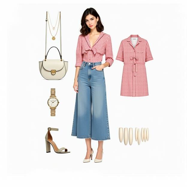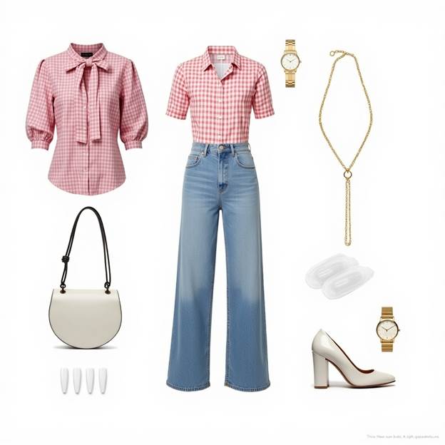 A light pink checkered shirt, like the bow style, brings a soft, feminine touch to any denim skirt. Tie the shirt at the waist or leave it open over a crop top for extra flair.