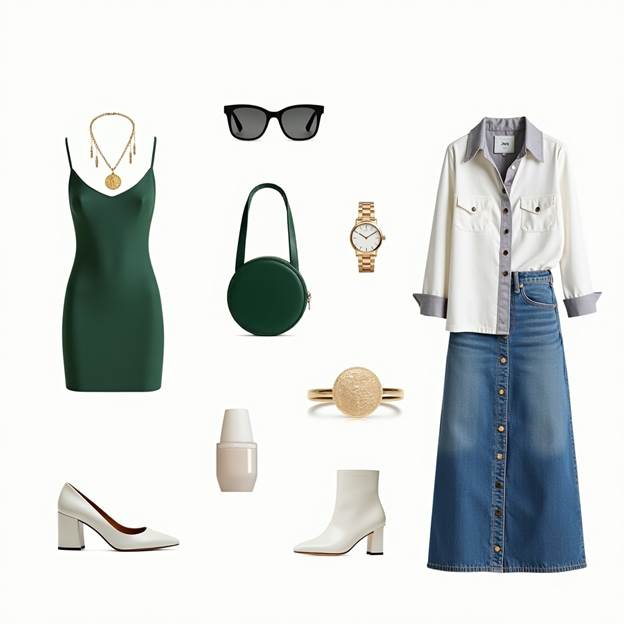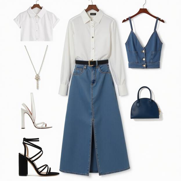 Channel retro vibes by pairing a crisp white shirt with a denim skirt, then top it off with a denim vest. This look gives classic layering a modern twist.