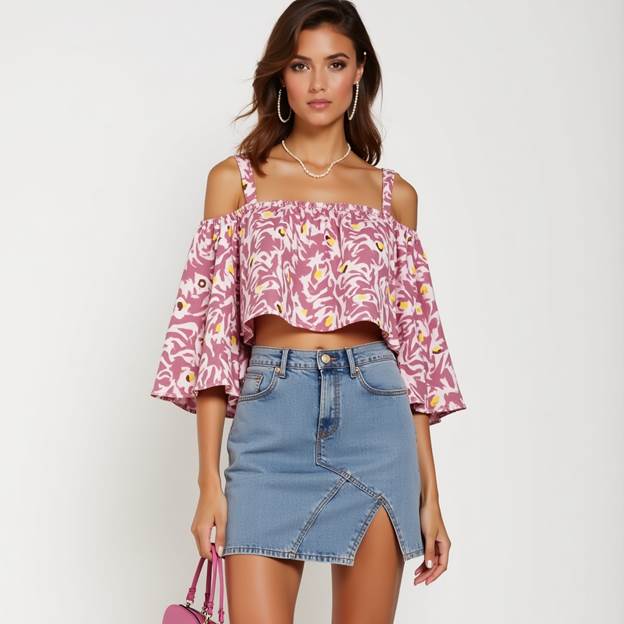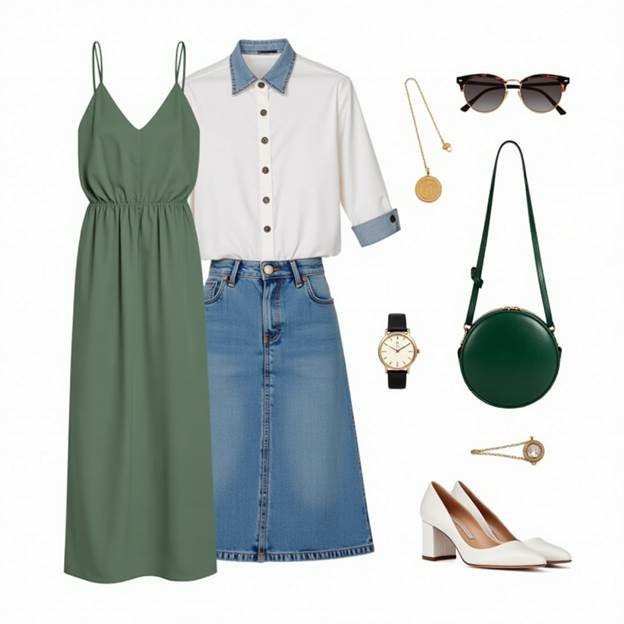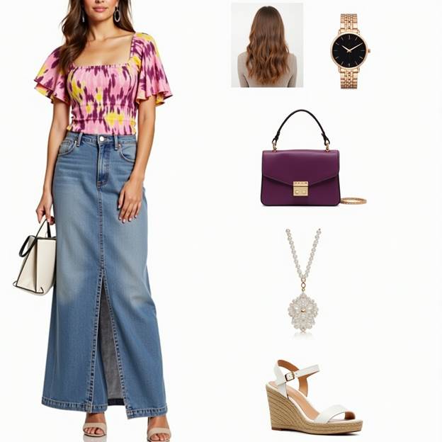 A soft pastel shirt paired with a classic denim skirt creates a fresh, calming summer vibe. Add white sneakers and a tote for the perfect everyday look.
