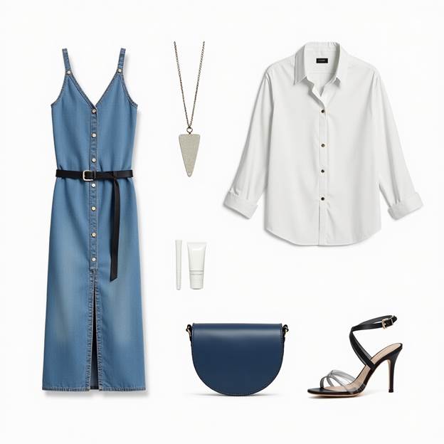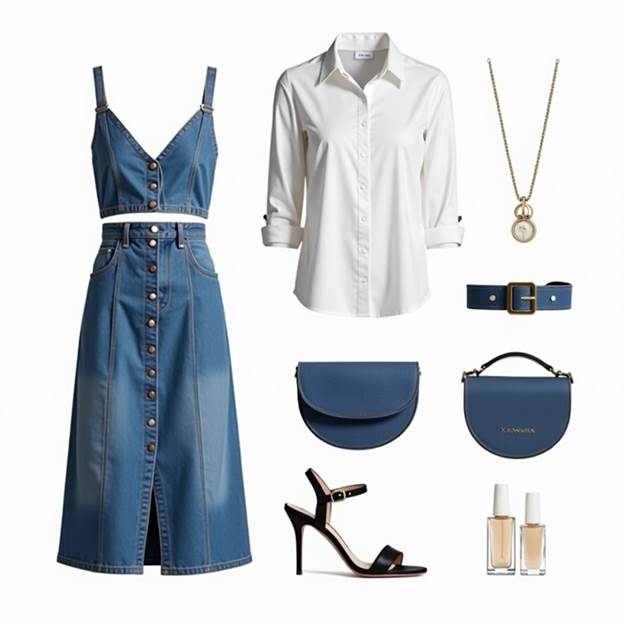 Double denim, reimagined! Pair a fitted denim camisole with a matching skirt, then layer a white-lined overshirt for added structure and contrast.