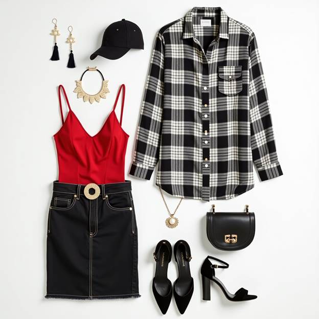 Turn up the heat with a bold red camisole tucked into a black skirt, layered with a casual checkered shirt. This combo strikes the perfect balance between edgy and chic.