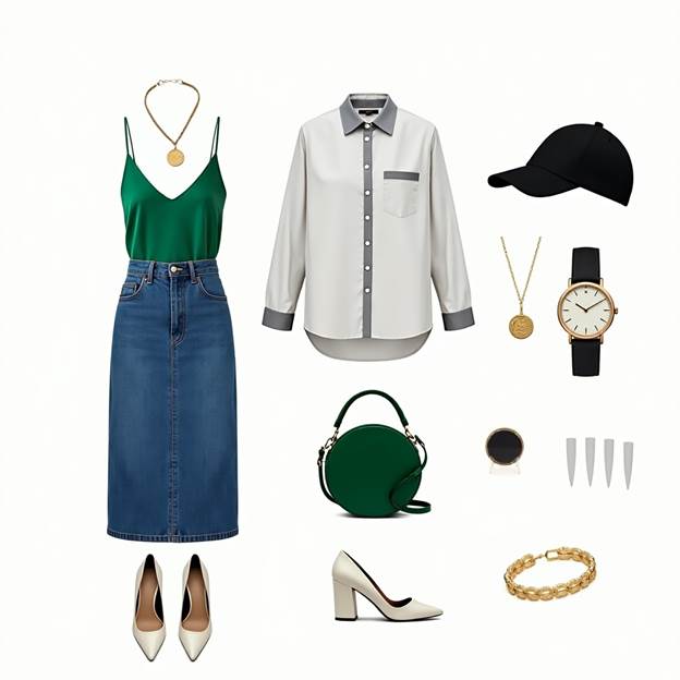 Channel retro vibes by pairing a green camisole with a denim skirt, then top it off with a a crisp white shirt. This look gives classic layering a modern twist.