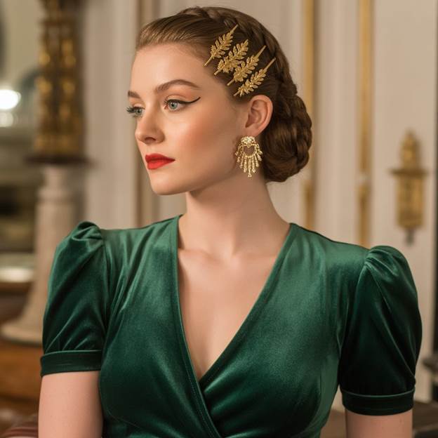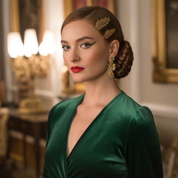 - Braided Low Bun with Gold Pins: Regal Vintage Elegance