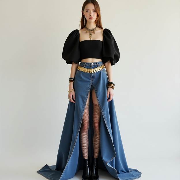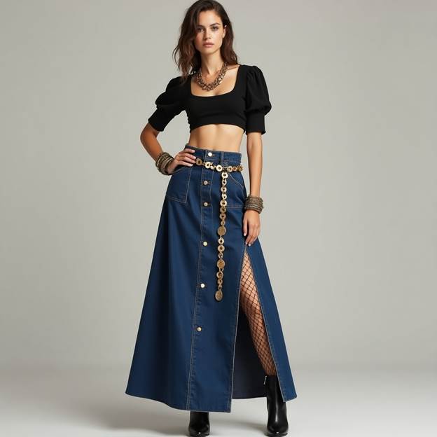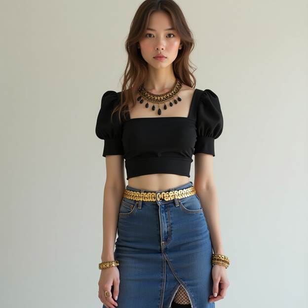 This look is sleek, minimal, and slightly edgy. A fitted black crop shirt paired with a light blue denim mini skirt creates contrast that pops. Add black knit tights to make it cooler-weather-friendly or perfect for an evening coffee stroll.