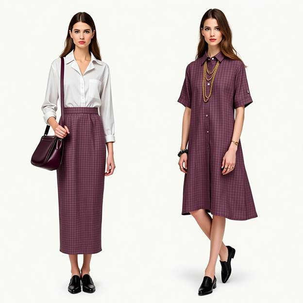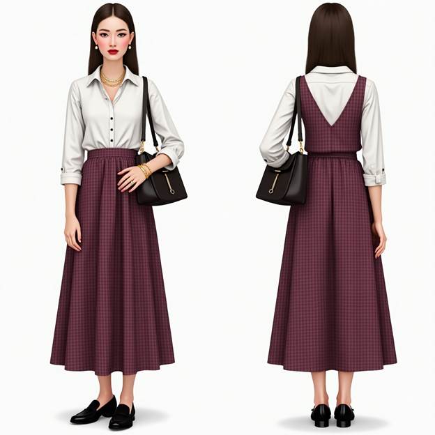This combo gives serious cottagecore-chic meets clean-girl vibes. The plum check skirt adds color and vintage energy, while a crisp white cotton shirt keeps it fresh and lightweight — perfect for hot summer days.