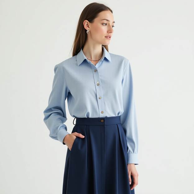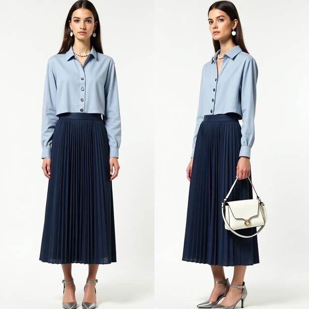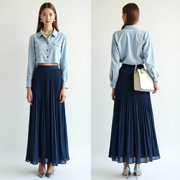 Tonal styling is on trend for 2025, and this look proves why. A blue-lined cotton crop shirt pairs beautifully with a plaited dark blue skirt. It’s clean, classic, and ready for both city walks and cute café visits.