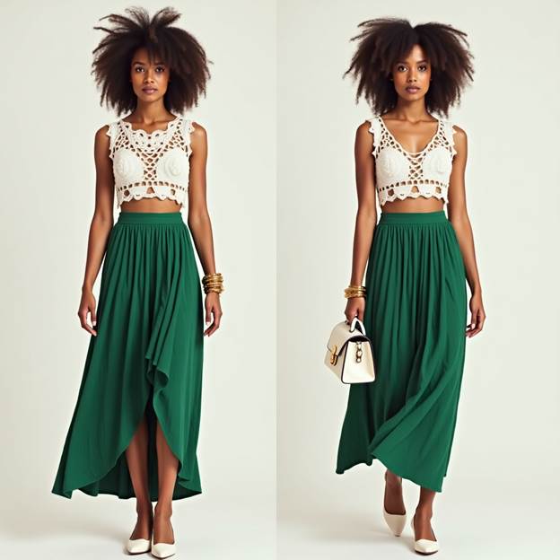 Textured contrast = outfit magic. The delicacy of the white crochet crop shirt blends beautifully with a pleated, flowy green skirt. It’s giving beach picnic or dreamy bookshop energy.