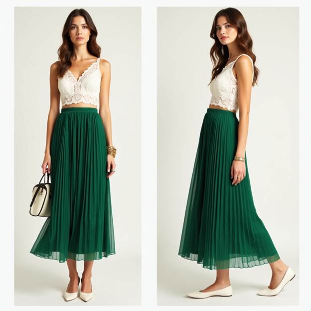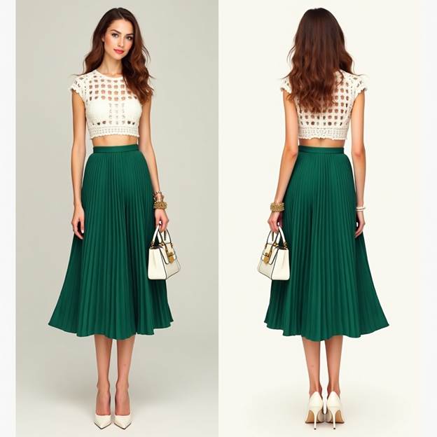 💚 4. White Crochet Crop Shirt + Pleated Green Skirt