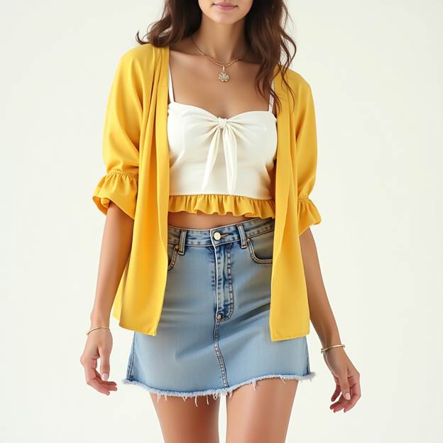 ☀️ 6. White Crop Top + Denim Mini Skirt + Yellow Jacket