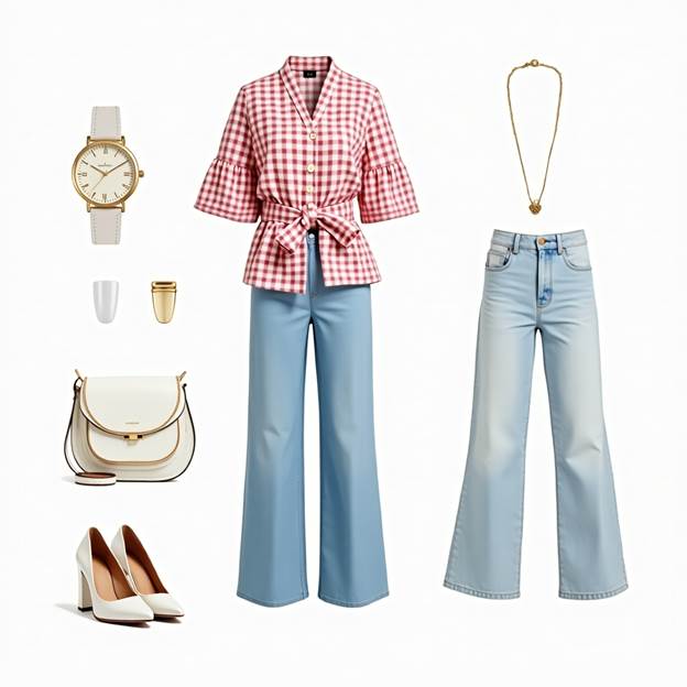 A light pink checkered shirt, like the bow style, brings a soft, feminine touch to any denim jeans. Tie the shirt at the waist or leave it open over a crop top for extra flair.